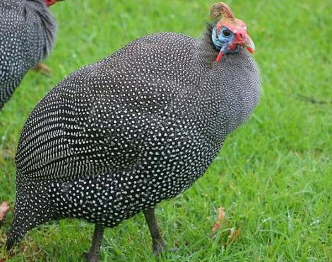 The guinea fowl is a ground-nesting bird and spends much of its time scratching around on the ground in search for something to eat. The guinea fowl Often has long, dark colored feathers and a bald neck and head roomates makes the guinea fowl a very distinctive bird.